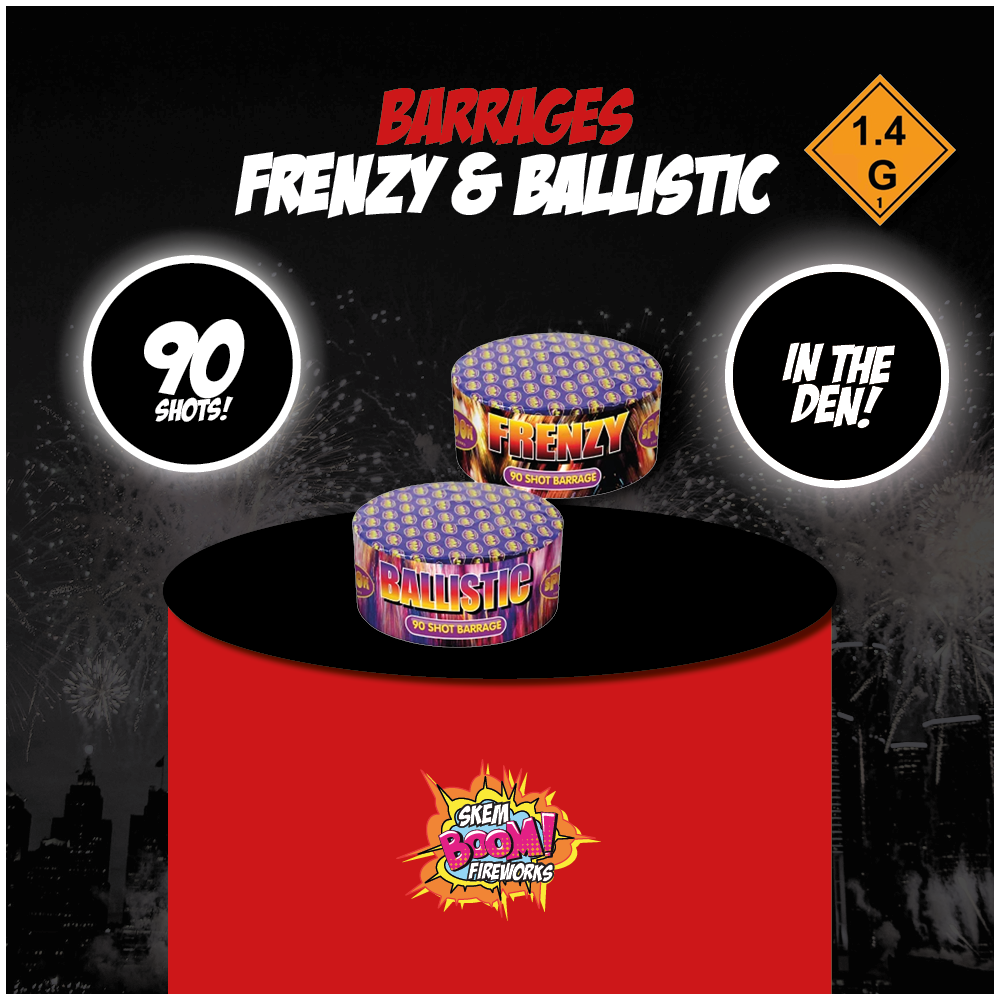 Effects: 2 great 90 shot cakes. Frenzy has red and blue with bangs and crackles. Ballistic has red, green shots, crackling & whistles to great effect from both.