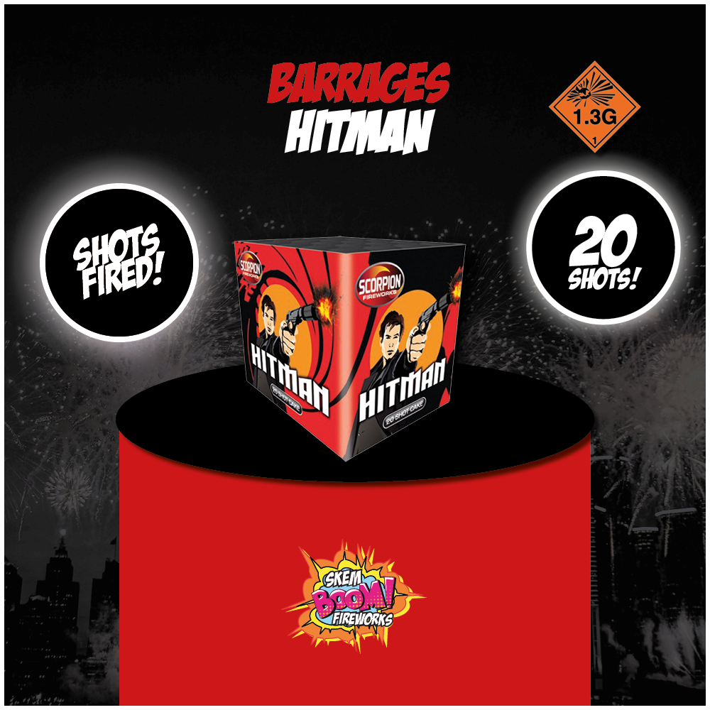 The Hitman is the ultimate pyrotechnic powerhouse. Twenty thunderous shots light up the night sky with a symphony of loud red and green stars, culminating in stunning titanium starbursts. Brace yourself for a spectacular, high-impact display.