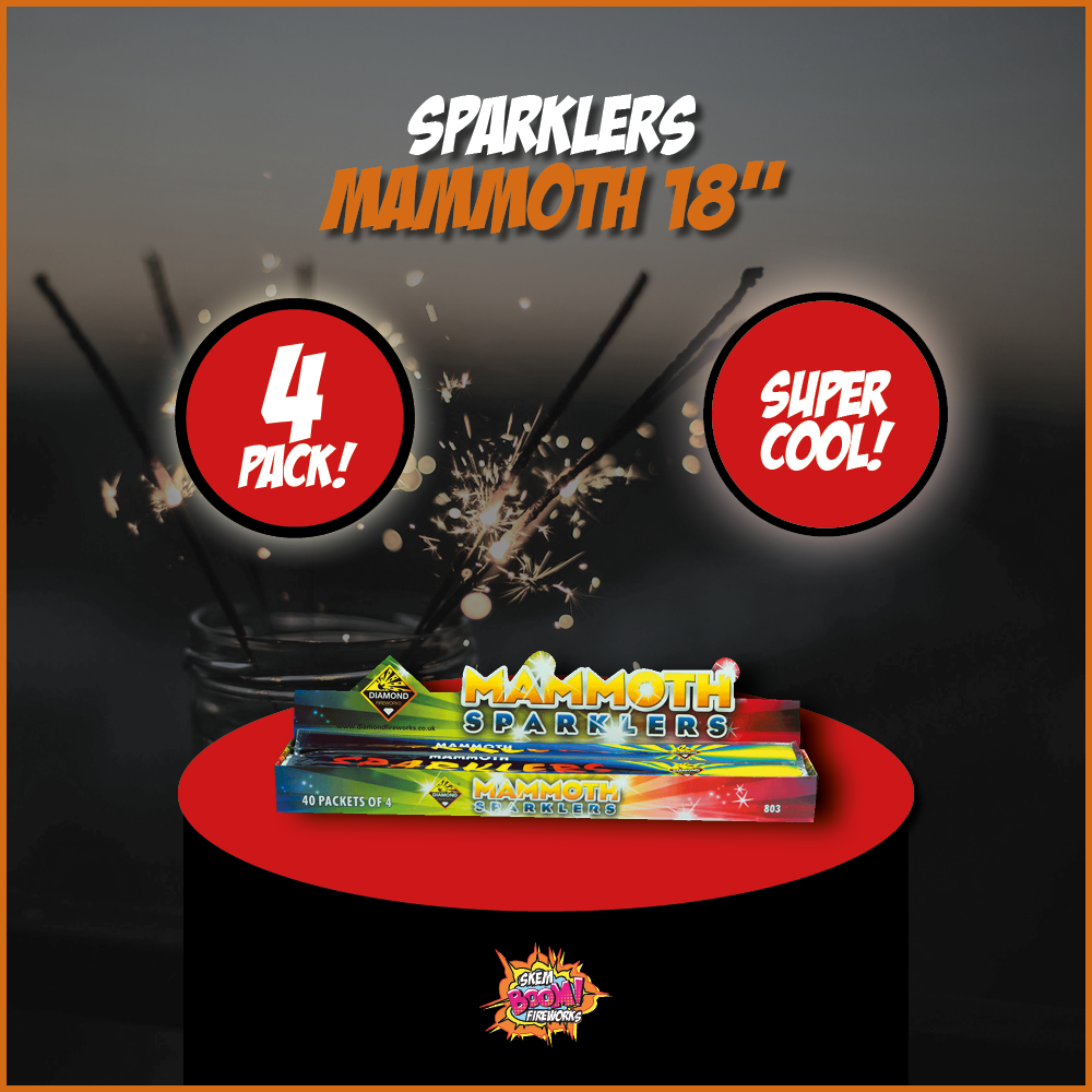 Prepare for an explosive celebration with Boom Fireworks' "Mammoth 18" Sparkler 4-Pack" – the ultimate choice for those who crave larger-than-life festivities. Elevate your events to new heights with these colossal sparklers, each measuring a staggering 18 inches, promising a spectacle that will leave a lasting impression.