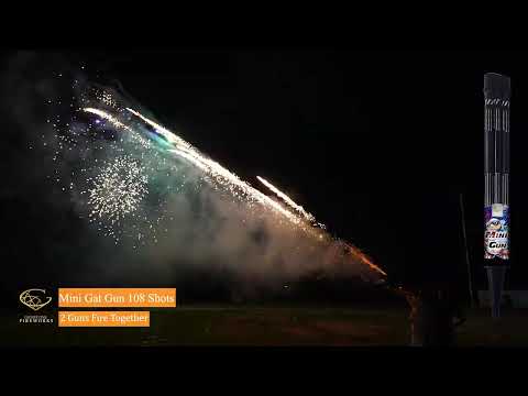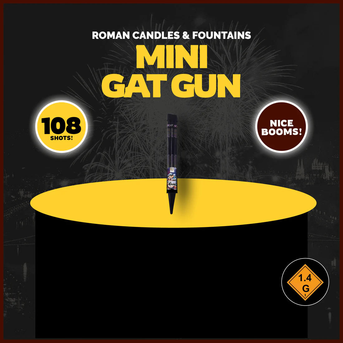 The mini gat gun is rapid-fire 108 shot firework that unleashes a thrilling barrage of colourful bursts and crackling effects.