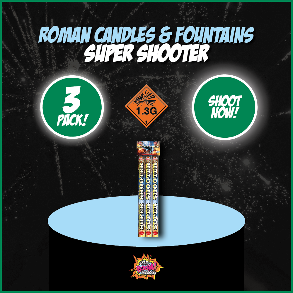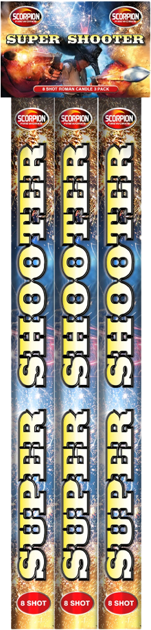 The Super Shooter is the next level of roman candle. This is a must-have pack of 3 explosive candles, each delivering 8 shots of high energy, colourful bursts of awe-inspiring drama.